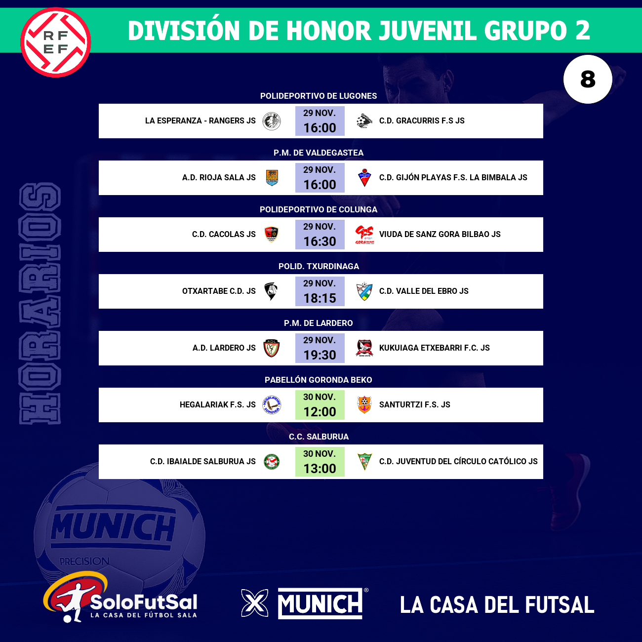 La octava jornada de la División de Honor Juvenil en el grupo donde militan los equipos asturianos se presenta cargada de retos y exigencia. Con 15 conjuntos en competición, esta semana le toca descansar a la Escuela de Fútbol Sala de Siero, el mejor representante asturiano hasta el momento, quinto clasificado con 12 puntos en siete partidos (cuatro victorias y tres derrotas). Los de La Pola llegan tras dos triunfos consecutivos que les han colocado en la parte alta de la tabla.