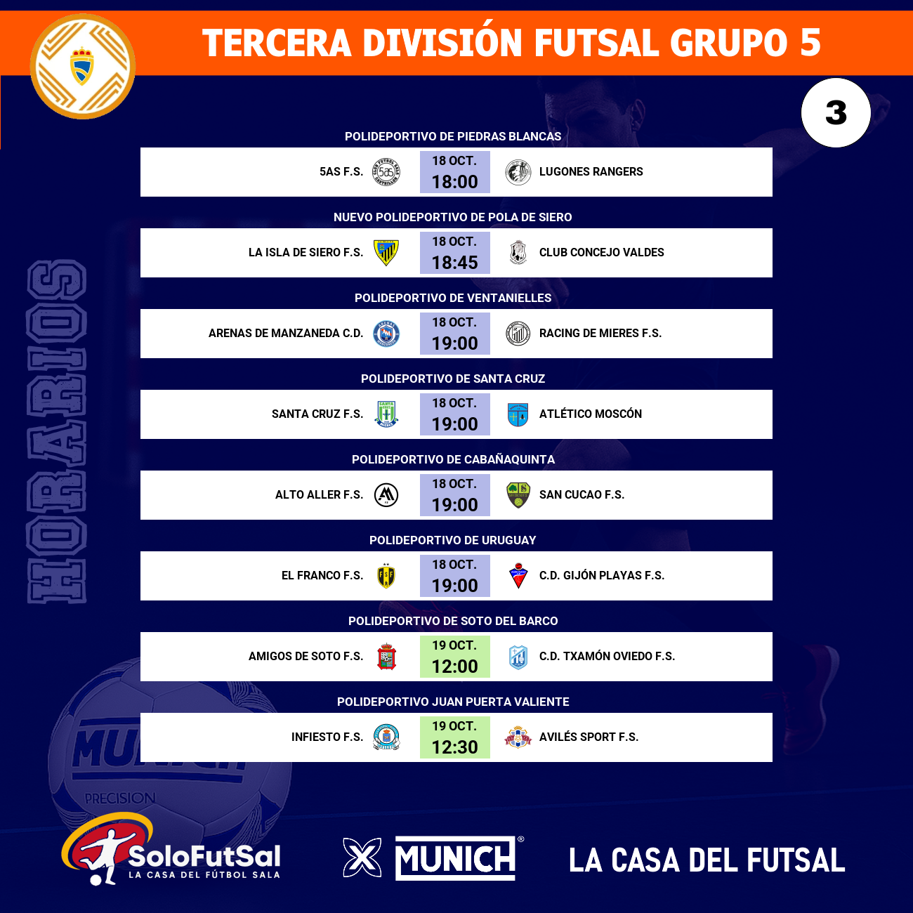 Infiesto F.S. - Avilés Sport F.S.: Un partidazo entre dos de los mejores equipos de la temporada inicial. Infiesto (4º, 4 puntos) recibe en casa al Avilés Sport (2º, 6 puntos), que también tiene pleno de victorias. Será un test de fuego para ambos y un pulso directo por la cabeza de la clasificación.