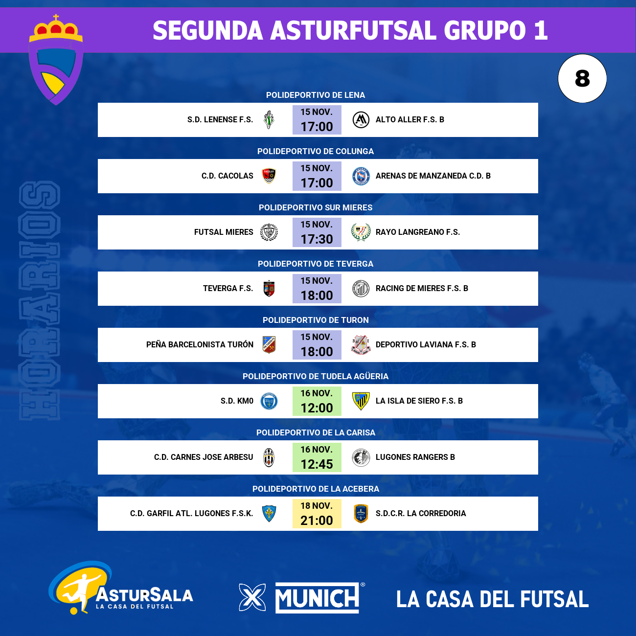 La octava jornada del Grupo I de Segunda Asturfutsal llega con el Teverga FS como líder en solitario con 18 puntos tras siete jornada, seguido por Futsal Mieres y La Corredoria FS, ambos con 13. Con 12 puntos se sitúa un grupo de perseguidores formado por la Peña Barcelonista de Turón, Lugones Rangers B, SD Lenense FS y La Isla de Siero FS B, que mantienen vivas sus opciones de engancharse a la pelea por el ascenso.