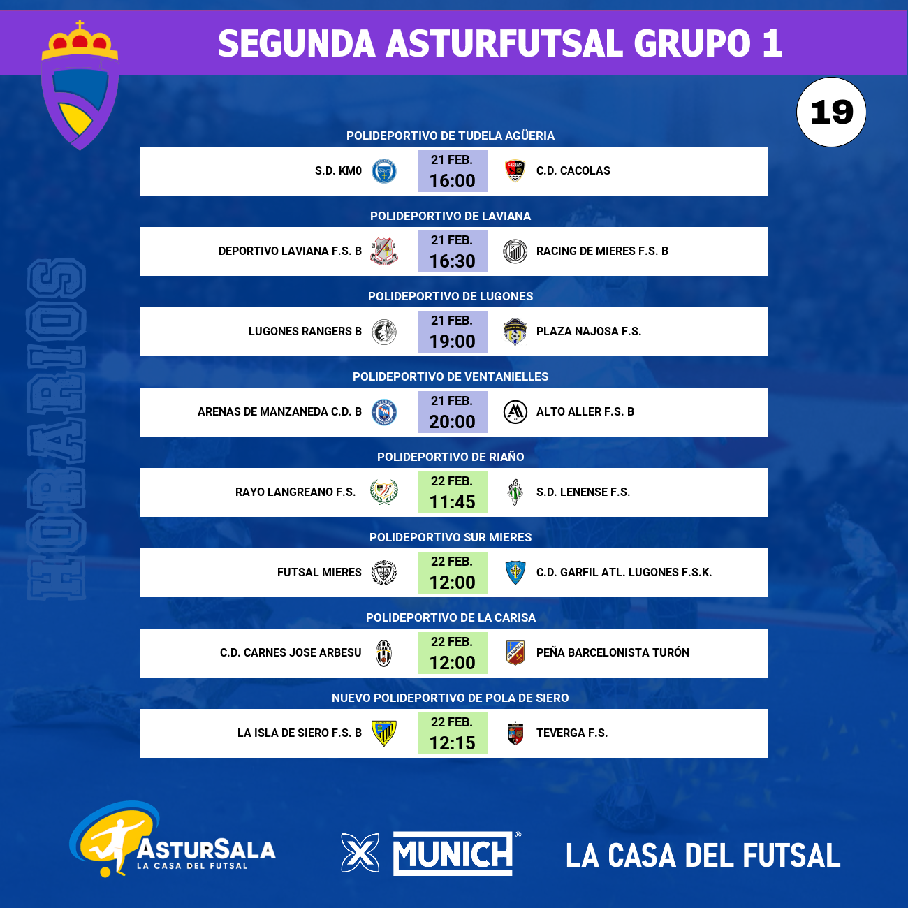 El balón echará a rodar en esta jornada 19 el sábado a las 16:00 horas en el Polideportivo de Tudela Agüeria. La S.D. KM0, colista en solitario con apenas 4 puntos y la peor diferencia de goles de la liga (-35), afronta el inicio de la segunda vuelta con la imperiosa necesidad de cambiar radicalmente su rumbo competitivo.