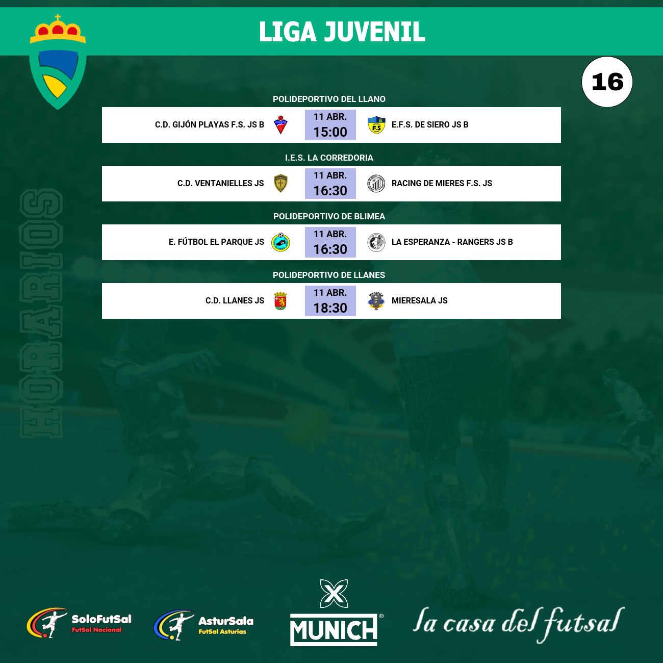 Precisamente en esa zona baja, la jornada se completa a las 16:30 horas en el Polideportivo de Blimea con un duelo de necesidades entre el E. Fútbol El Parque y La Esperanza - Rangers B. Los locales, séptimos con 11 puntos, buscarán romper su mala racha ante el colista de la categoría (7 puntos). Para el filial de La Esperanza, este partido representa una oportunidad inmejorable de abandonar el farolillo rojo en este tramo final y recompensar el esfuerzo de sus jóvenes jugadores, en una jornada 16 donde el E.F.S. de Siero C cumplirá con su turno de descanso.
