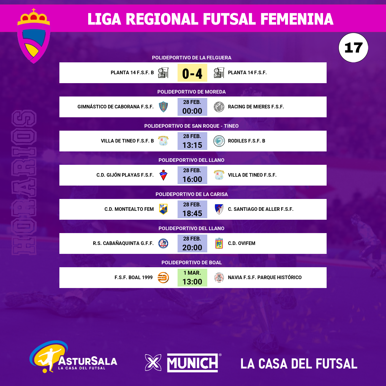 Por último, es imprescindible mencionar la situación excepcional que atañe al séptimo clasificado, el Gimnástico de Caborana F.S.F., que cuenta con 21 puntos en su haber. En esta Jornada 17, el equipo disfrutará de un merecido descanso competitivo debido a la retirada oficial del Racing de Mieres F.S.F. de la competición.