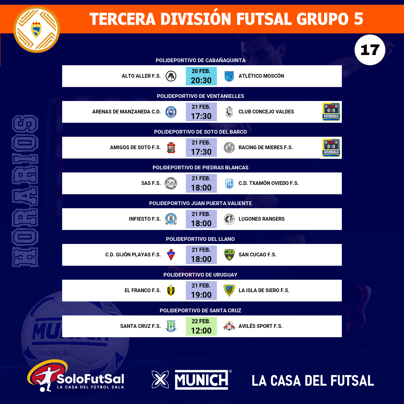 Los locales necesitan hacerse fuertes en casa tras su derrota (8-3) ante el líder, el San Cucao. Por su parte, el conjunto sierense, que viene de un trepidante 7-7 ante el Arenas de Manzaneda, confiará en el instinto de Alexis Garcia, quien acumula ya 21 goles en la competición.