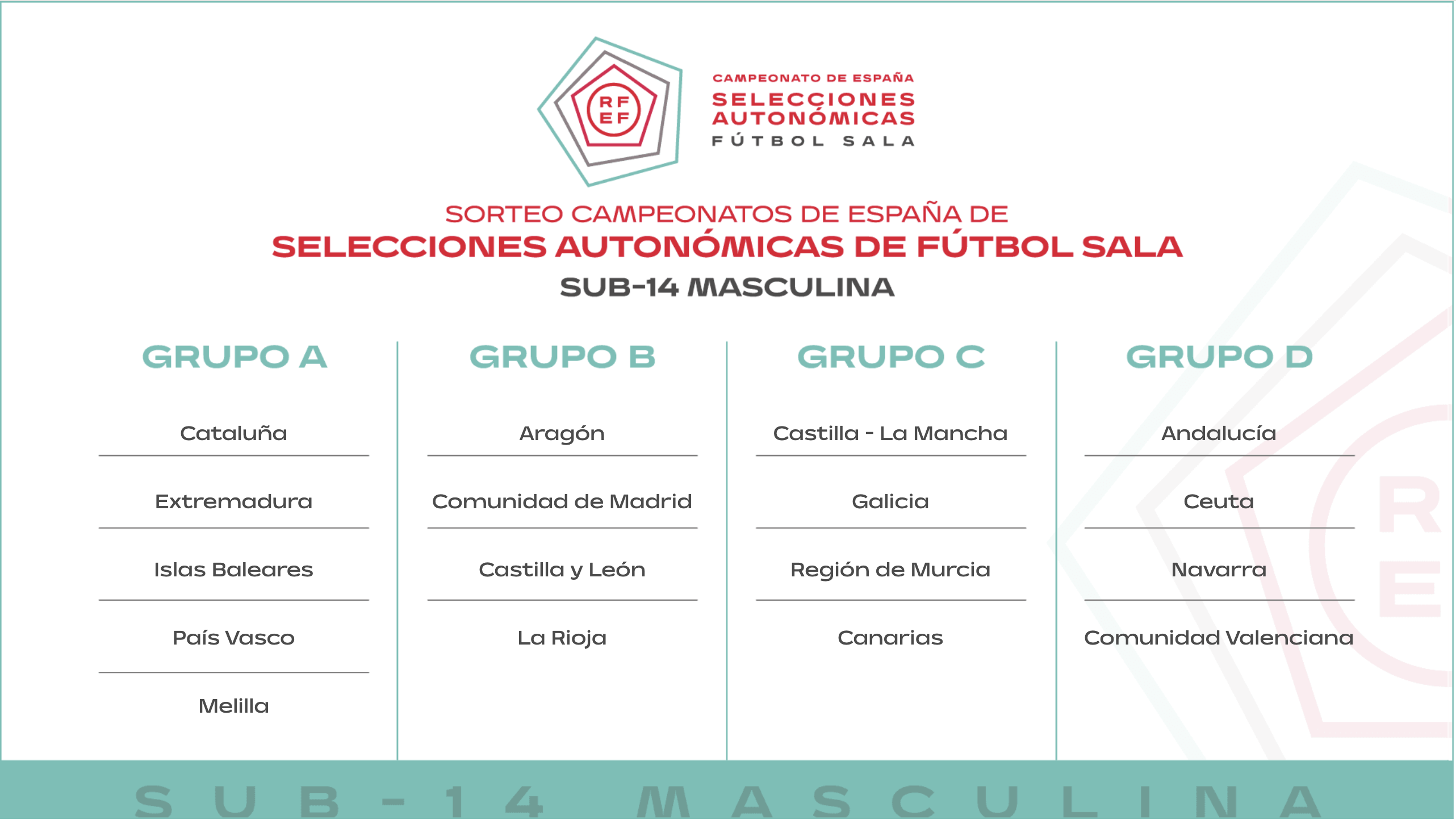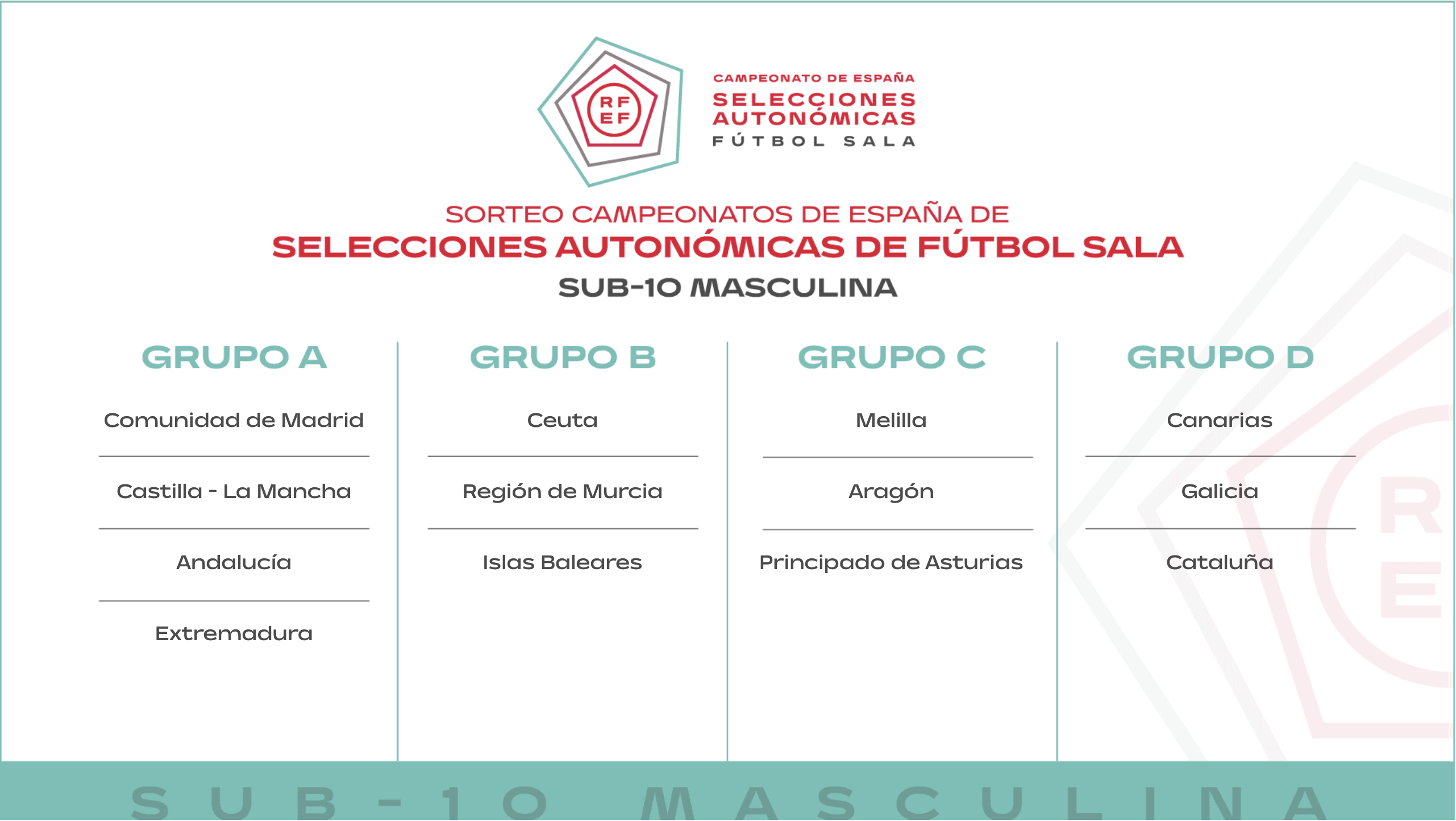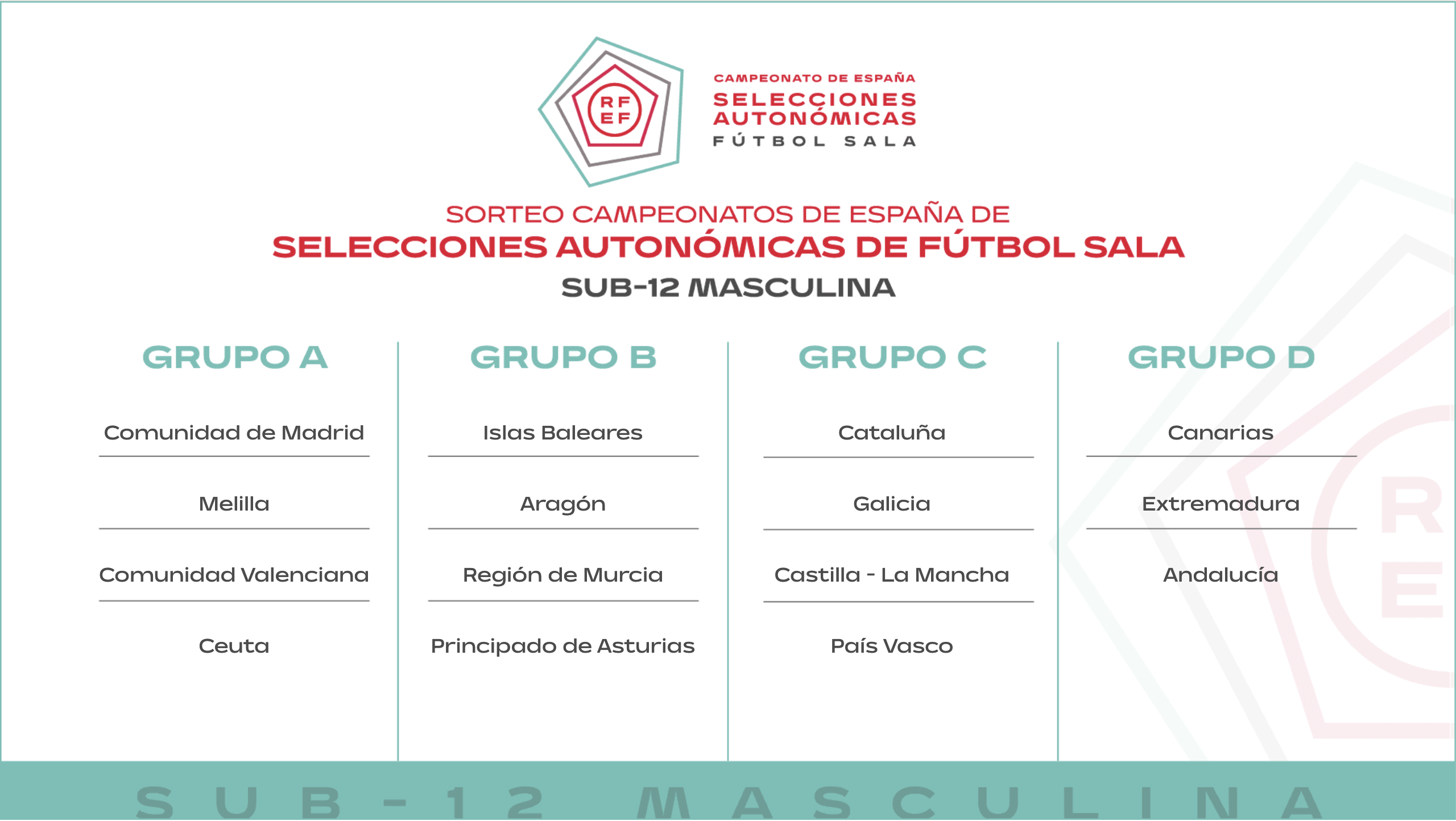 En la tarde del martes 25 de noviembre se celebró el sorteo oficial de los grupos que conformarán los Campeonatos de España de Selecciones Autonómicas de Fútbol Sala (CESA) para la temporada 2025/26. La competición, organizada por la Real Federación Española de Fútbol, reunirá a selecciones territoriales en ocho categorías, distribuidas por edades y género, con sedes y formatos diferenciados.