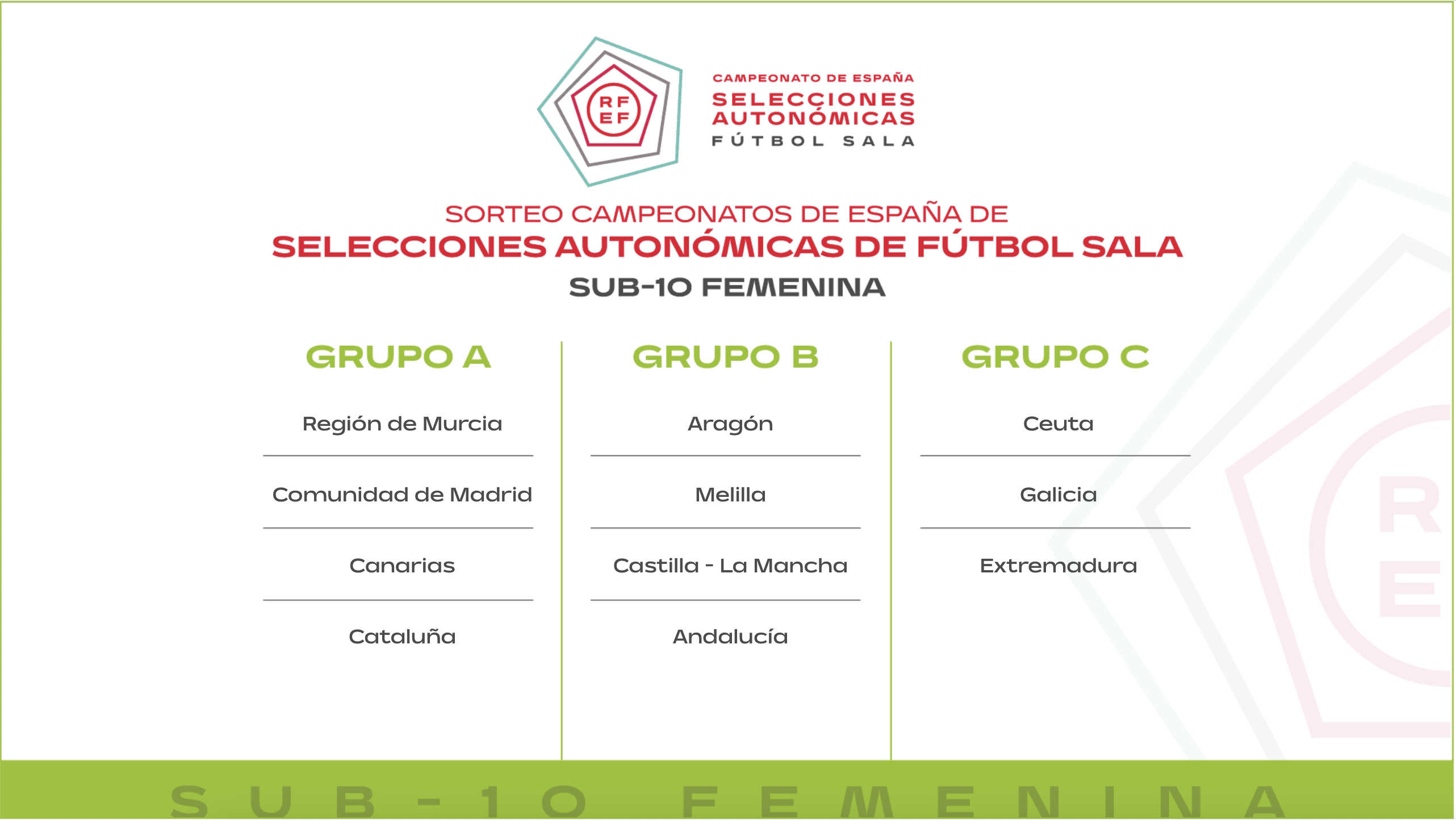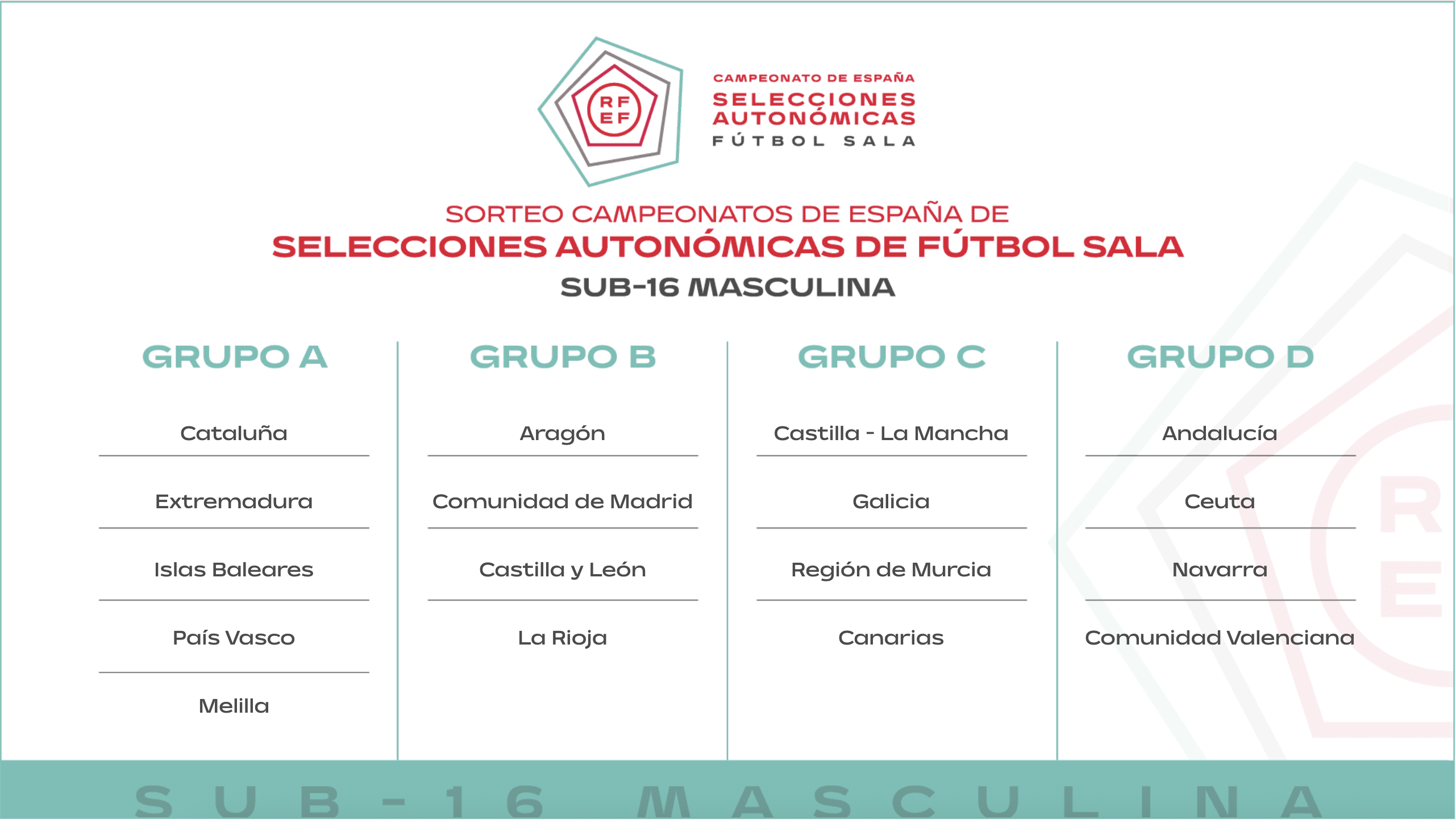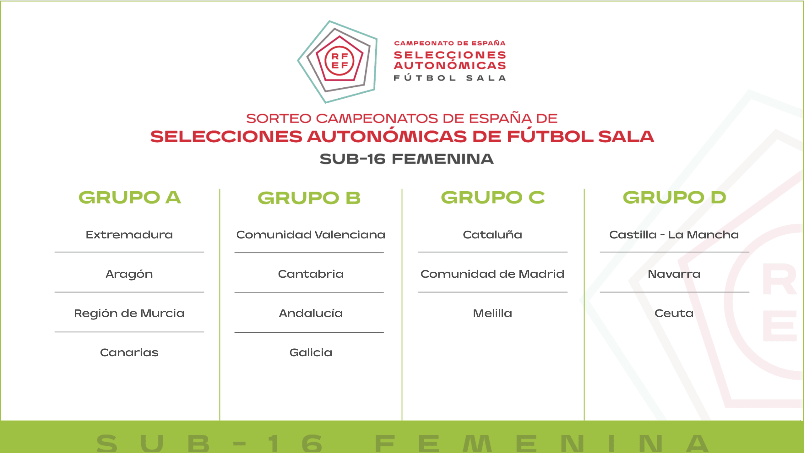 En la tarde del martes 25 de noviembre se celebró el sorteo oficial de los grupos que conformarán los Campeonatos de España de Selecciones Autonómicas de Fútbol Sala (CESA) para la temporada 2025/26. La competición, organizada por la Real Federación Española de Fútbol, reunirá a selecciones territoriales en ocho categorías, distribuidas por edades y género, con sedes y formatos diferenciados.