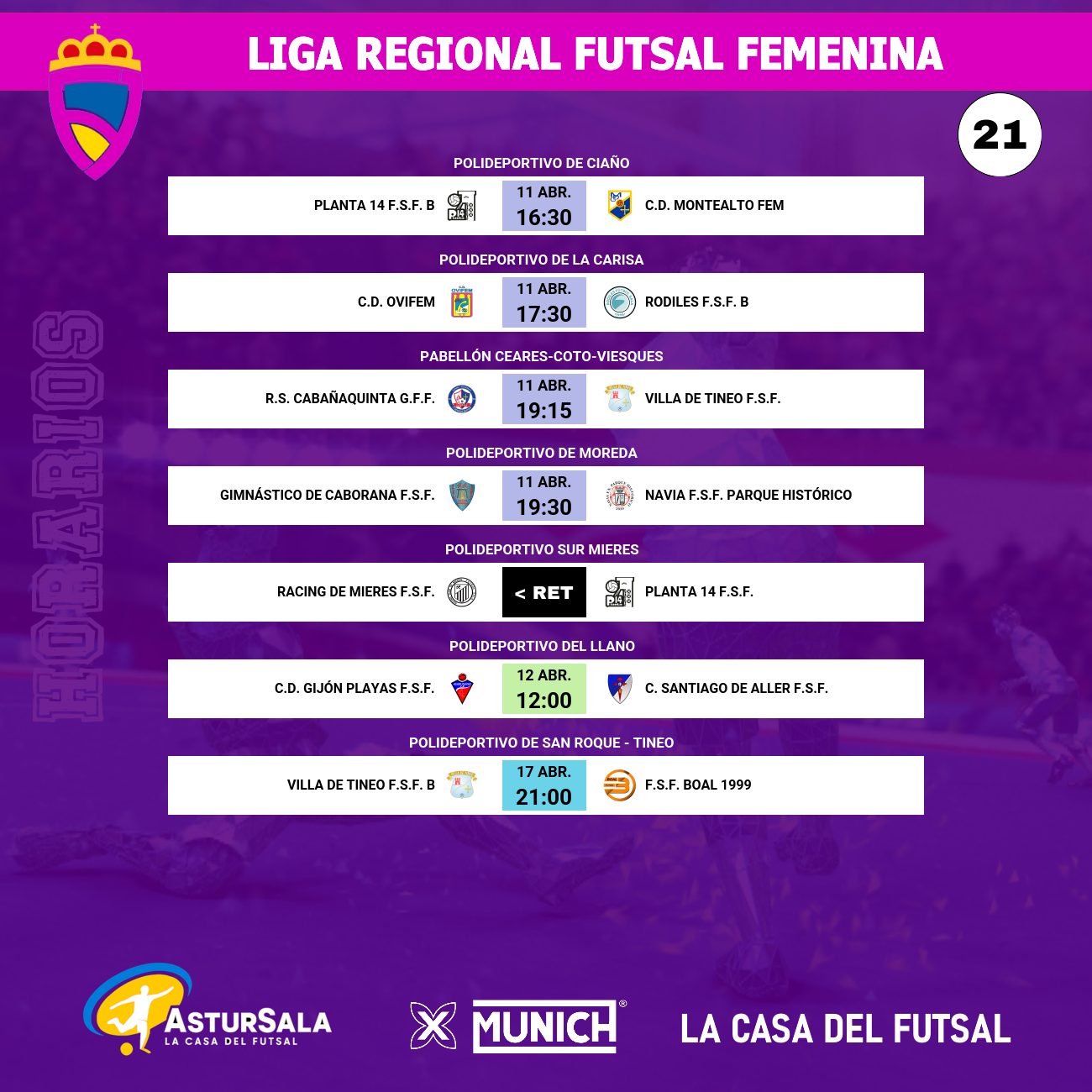 Finalmente, la jornada se completará el viernes 17 de abril a las 21:00 horas en el Polideportivo de San Roque con el encuentro entre el Villa De Tineo F.S.F. B y el F.S.F. Boal 1999. Se trata de un interesante duelo de la zona media-baja entre el undécimo (12 puntos) y el décimo clasificado (16 puntos). Ambos conjuntos se encuentran ya demasiado lejos de la pelea por la Copa, pero el orgullo competitivo sigue intacto.